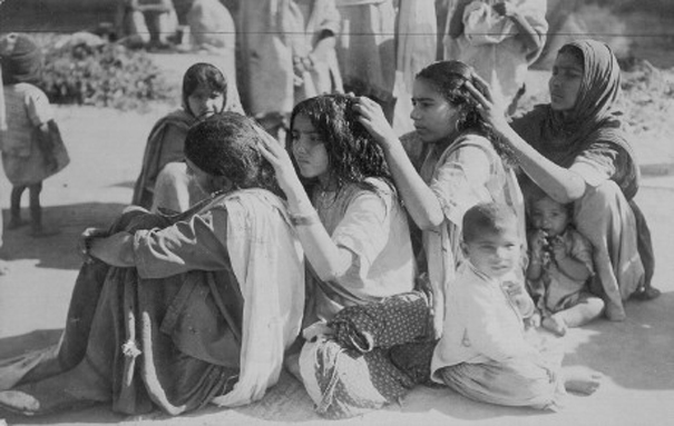 Young gang members compete to find the most lice. The cooties were also known as chats. Hence chatting together.