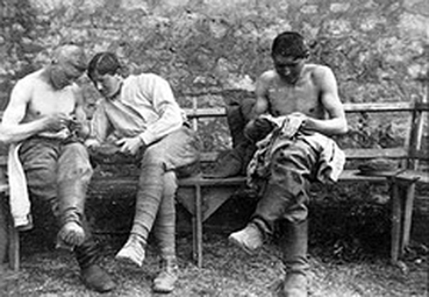 Soldiers enjoying taking care of their pet lice. World war 2.